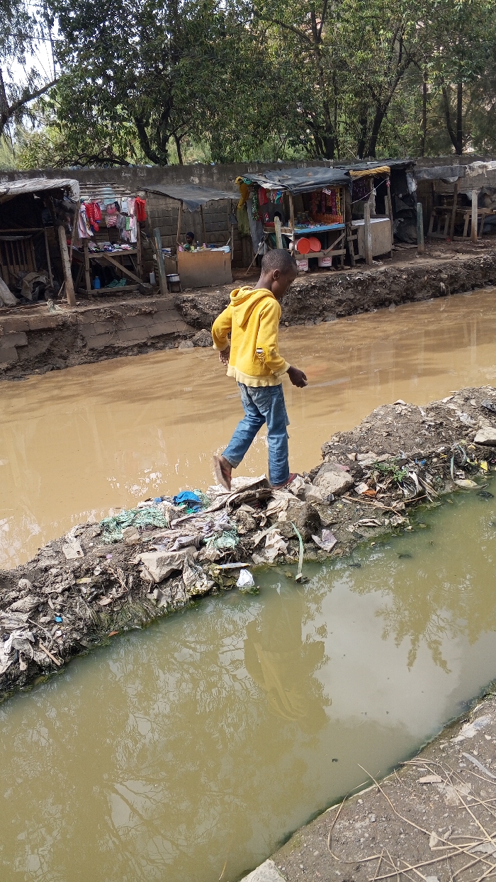 The image depicts an informal settlement in Nairobi, Kenya, characterized by makeshift structures bordering a wide, murky water channel