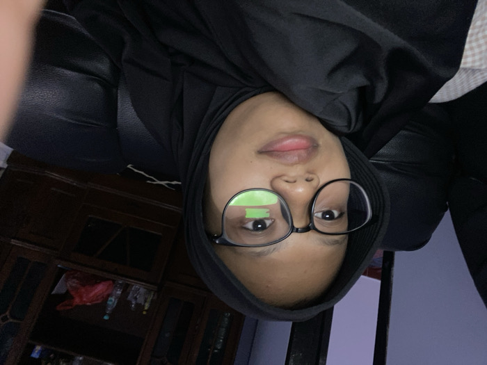 n indoor scene in Kebonsari, Indonesia. A single individual is present, identified as likely female, wearing a black hijab and black-framed eyeglasses. The person has dark skin and a neutral expression, looking directly forward. Green light reflections are prominently visible on the right lens of the eyeglasses, with a smaller reflection on the left. The individual is reclining against a dark, possibly black leather, sofa or armchair. A light-colored, checkered or patterned fabric is visible beneath the person on the lower left. In the background, to the right of the individual, a dark wooden cabinet or hutch is visible. On top of this cabinet are several clear glass containers, plastic water bottles, and a crumpled red plastic bag. The upper left background shows a wall or structural element under dim, purplish-blue lighting. A partially obscured thumb or finger is visible in the lower right foreground, suggesting the image is a selfie. The overall environment is dimly lit.