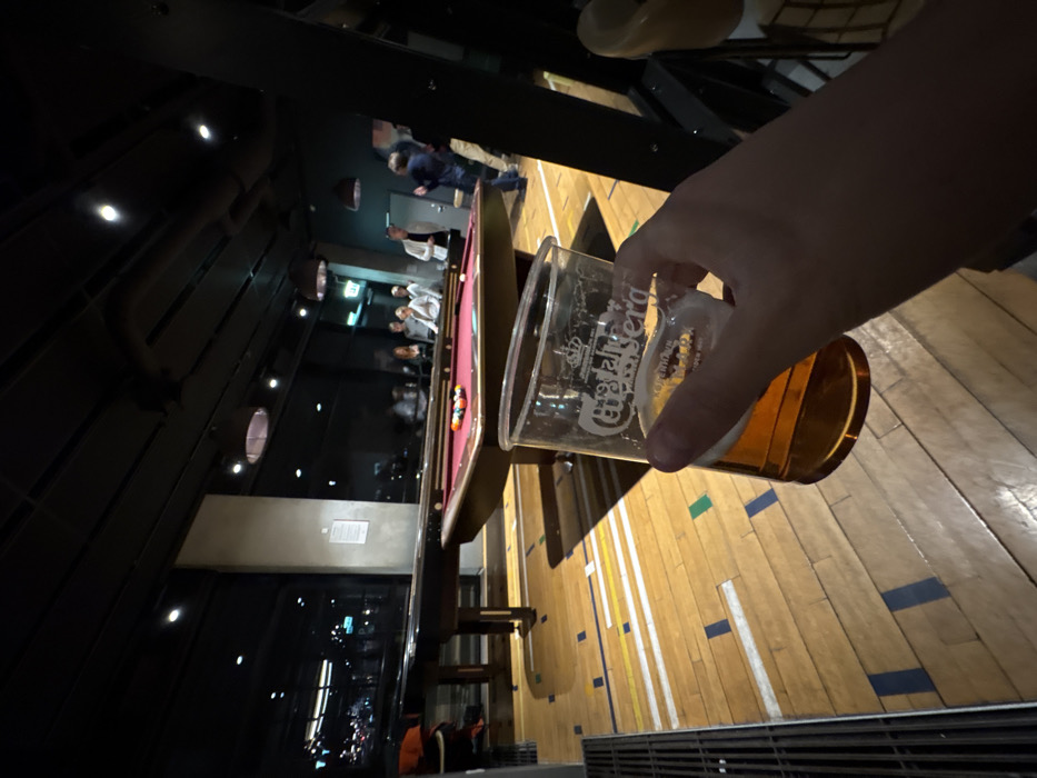 A person holds a half-full plastic cup of beer, with "Carlsberg" branding visible, over a wooden floor marked with colored lines. In the background is a pool table with people standing around it, positioned in a dark, modern architectural space. Outside a window is an urban night scene with city lights. The image has been rotated and tilted.