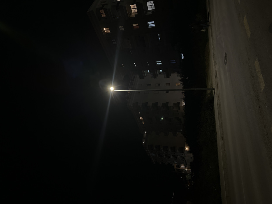 The image depicts a nighttime scene in Šušanj, Montenegro. A prominent streetlamp with a bright, solitary light source stands centrally, illuminating a section of a dark asphalt road in the foreground. The road surface shows faint white rectangular markings and a circular manhole cover. Behind the road, a dark, dense hedge or line of shrubbery runs horizontally across the frame. Beyond this vegetation, multiple residential or mixed-use buildings of varying heights are visible, several with illuminated windows displaying warm or cool light. Some buildings feature visible balconies. A faint, illuminated sign, possibly reading "D'merre," is discernable on the lower portion of one of the buildings on the right. On the far right edge of the frame, a dark, indistinct figure of a person is partially visible near the roadside. The sky is dark and clear, or uniformly overcast, with no celestial objects visible.