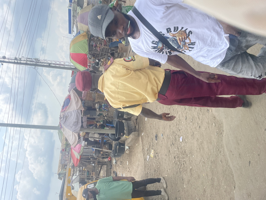 An outdoor scene in Agbara, Nigeria, depicts a busy market or street area under an overcast sky