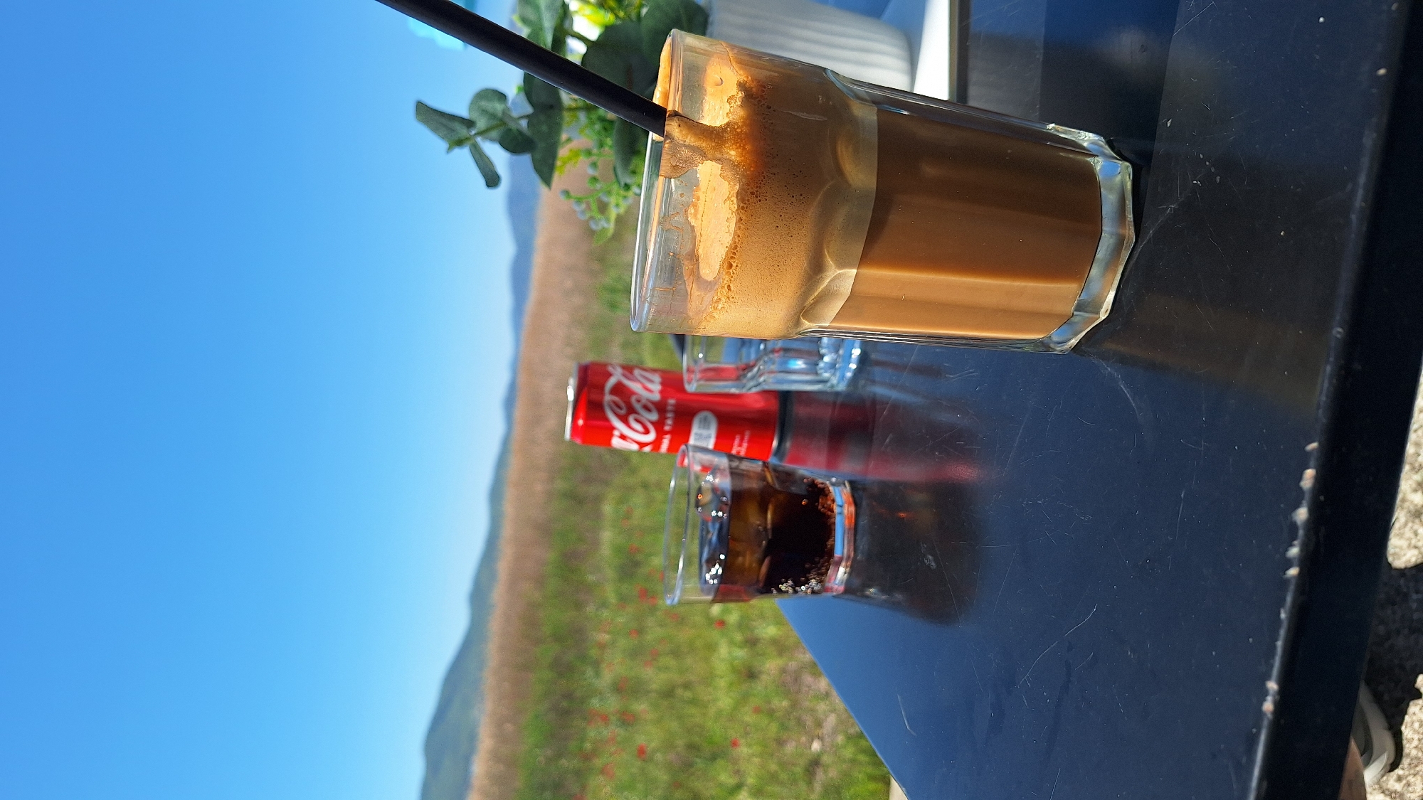 The image captures a scene at an outdoor cafe in Doirani, Greece, with a clear blue sky and a field dotted with red flowers and mountains in the background. A black table holds a glass of frappe with a black straw, a can of Coca-Cola, and a small glass of Coca-Cola with ice. The location is likely near the Doirani Lake region due to the geography. There are no people visible in the image, but the composition suggests someone is at the table. The lighting indicates it is daytime.