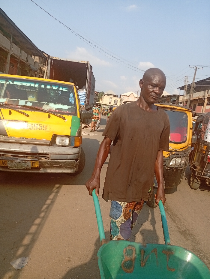 An older man in a brown t-shirt and patterned pants stands in a street, holding a green wheelbarrow