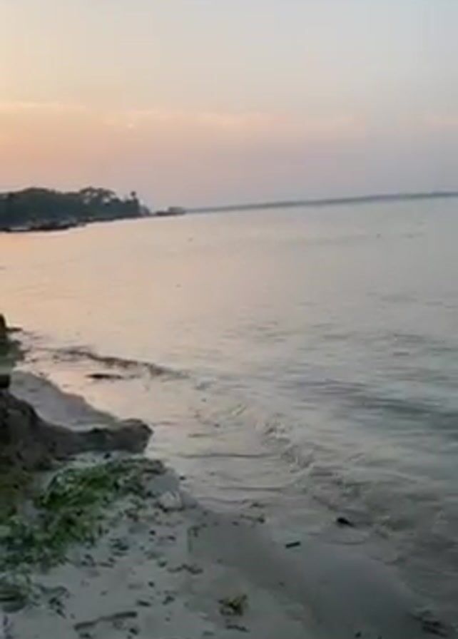 body of water with a sandy beach on the left and a person in a red sari walking into the water. The water is calm with small waves lapping at the shore. The sky is a light blue with a hint of pink. There are some trees and buildings visible in the distance. The person in the sari walks into the water and then turns to face the camera.