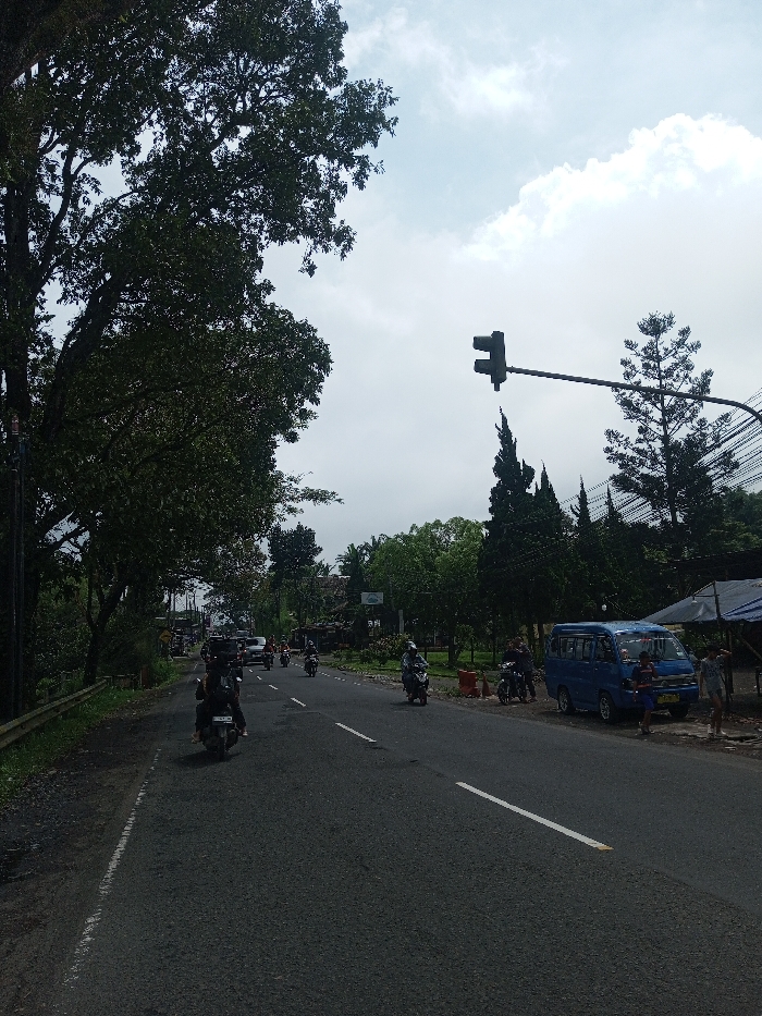 The image depicts a daytime street scene in Sandamal Eliya, Sri Lanka, captured from a low angle. A two-lane asphalt road with a solid white edge line on the left and broken white lane markers in the center extends into the distance. Numerous vehicles, predominantly motorcycles, are present on the road, traveling away from the viewer. In the foreground, a dark-colored motorcycle with two occupants wearing dark clothing is visible in the left lane. Further down the road, several additional motorcycles and cars are observed in motion. On the far left, a dense line of trees with dark foliage runs alongside the road, partially obscuring a light-colored guardrail and a utility pole. The sky is overcast with patches of lighter cloud cover. On the right side of the road, a blue passenger van is parked on the shoulder adjacent to a roadside stall covered by a blue tarp. Three individuals are visible near the blue van: one in a red shirt and dark shorts near the van's front, another in a light-colored top and shorts standing by the tarp structure, and a third partially obscured behind the van. Further right, a motorcycle is parked near the van. Overhead, a black, horizontal traffic light is suspended across the road. A cluster of coniferous trees and other green foliage forms a backdrop behind the roadside area on the right, with a partially visible blue and white sign amidst the trees in the midground.