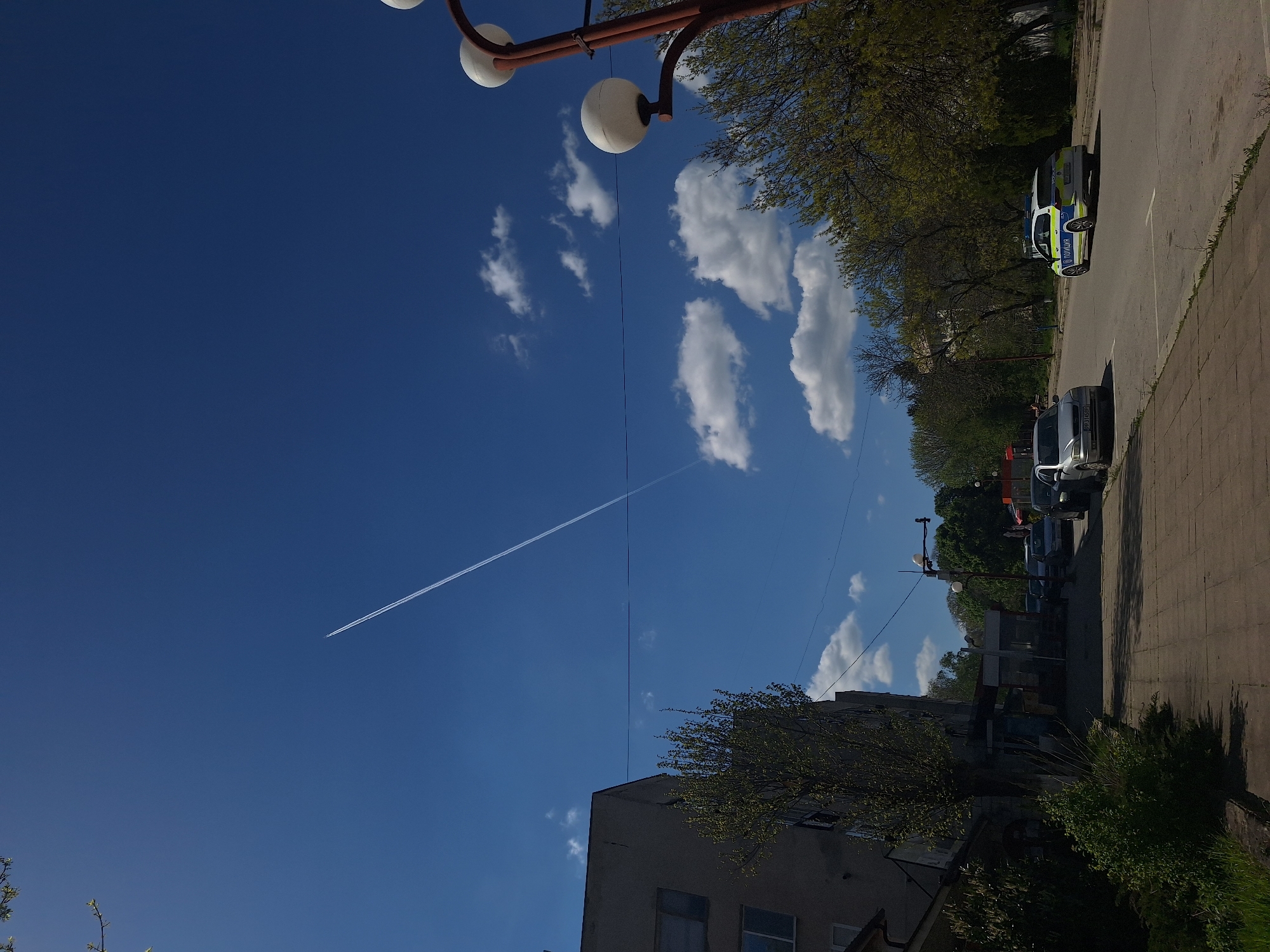 view of Loznitsa, Bulgaria, featuring a clear blue sky with contrails and scattered clouds. The scene includes a building, street lighting, trees, parked cars including a police car, and a sidewalk along a road.