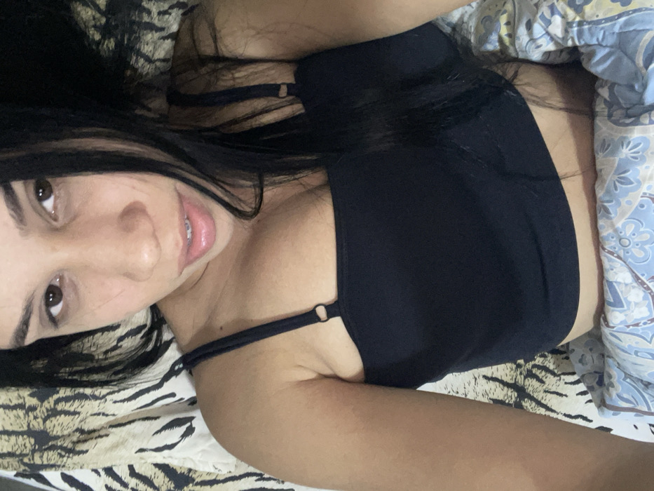 A young adult female is depicted in an indoor setting, positioned on what appears to be a bed. She has dark, long hair, brown eyes, and is observed with orthodontic braces on her upper teeth. She is wearing a black, thin-strapped crop top. The bedding visible includes a light-colored item with a dark, tiger-stripe pattern on the upper left, and a blue and white patterned sheet or blanket below the subject's mid-section. The female is looking directly towards the camera, suggesting a self-portrait. The precise location within the city of Altagracia, Venezuela, cannot be determined from the visual information provided.