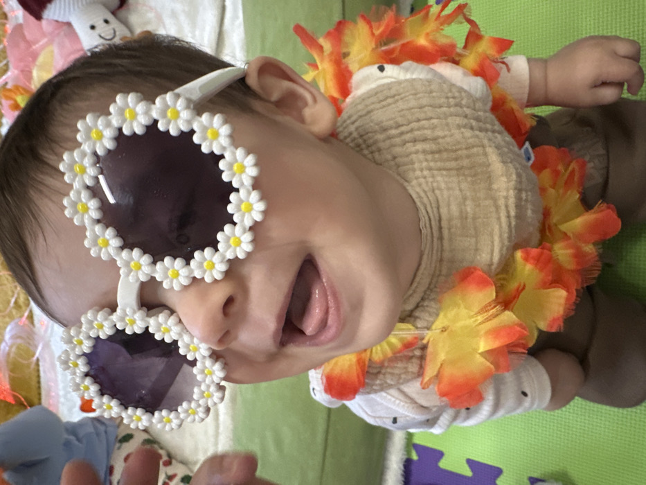 A baby is depicted in an indoor setting in Prestbury, United Kingdom, facing slightly upwards and towards the viewer's right. The baby wears oversized, white-framed sunglasses adorned with white daisy flowers and dark purple tinted lenses. A multi-colored lei, primarily yellow and orange, is draped around the baby's neck. Underneath the lei, a beige, textured bib is visible over a light-colored, long-sleeved top with small dark speckles. The baby's mouth is open, revealing the tongue, indicating a laugh or wide smile. Dark brown trousers are visible on the lower body. A partial view of an adult's hand, including an index finger and thumb, is visible on the left, near the baby's upper arm. The baby is positioned on a light green playmat with a visible purple edge in the bottom left. The background consists of blurred soft furnishings, including a white object resembling a plush toy with a simple black facial feature.