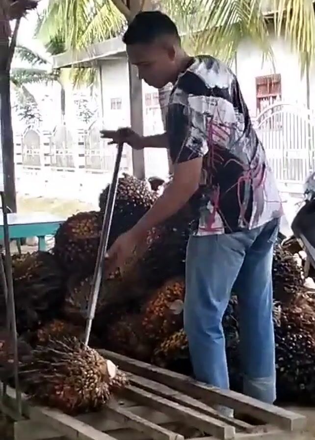 A man stands on a wooden platform in front of a large pile of palm fruit, using a long, thin tool to manipulate the fruit