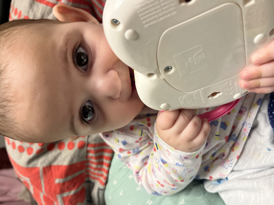 A baby with dark eyes and a small nose is lying down, looking directly at the camera. The baby has fair skin and is wearing a patterned, long-sleeved shirt. The baby's right hand holds a white plastic toy with visible screws and a pink handle. The background includes a pillow with a red and gray pattern and another with a light green hue.