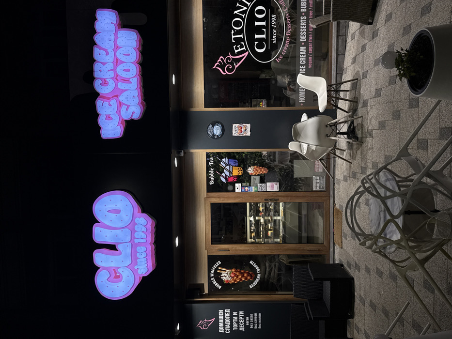 - "The image depicts the exterior of the "CLIO since 1998 ICE CREAM SALOON" in Nesebar, Bulgaria, captured at night or under low light conditions" by FM-zcZ6x1, licensed under CC BY 4.0