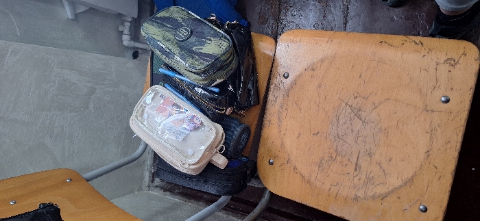 The image displays an indoor scene, likely a classroom or institutional setting. The specific location in Pernik, Bulgaria, cannot be determined from the visual evidence. In the foreground, a light-brown wooden chair seat, heavily scratched and scuffed, occupies the lower portion of the frame. Four silver-colored rivets secure its structure. Directly above this seat, resting on what appears to be another chair or flat surface, is a collection of small bags and pouches. Prominently featured are: a transparent or translucent beige pencil case, revealing various small, colorful items inside; a black, glossy pouch, possibly made of patent leather; and a camouflage-patterned (greens, browns, blacks) pouch featuring a circular emblem on its front. Several blue pens are visible among these items. A dark, possibly black, bag is partially visible beneath the other pouches. The background consists of a vertical, light-brown wooden chair back, attached to a gray metal frame, with two visible silver rivets. Behind the chair and bags, a textured, light-grey wall is present, possibly painted concrete or plaster. Towards the lower right corner of the wall, a white pipe structure, potentially part of a heating system, is visible. The floor beneath the objects is dark and appears to be a hard surface. No individuals are visible, nor are any actions or interactions depicted.