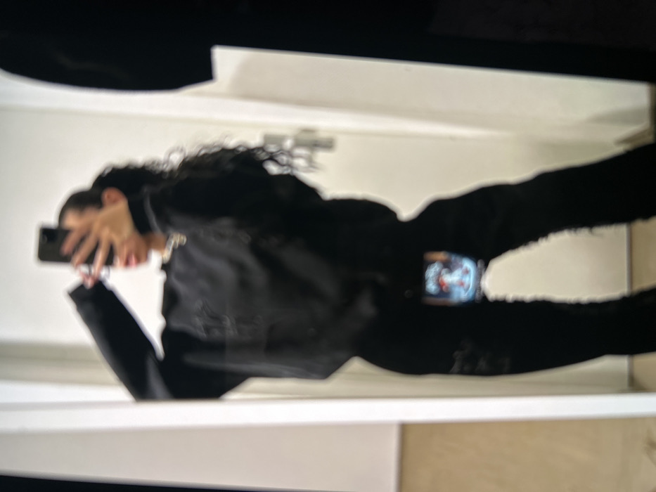 A person with dark, curly hair takes a mirror selfie. They wear a black jacket and black pants. The phone is held up to obscure part of their face. On their pants, near the hip, a colorful image is visible, possibly from another screen or patch. The surroundings include a white wall and ceiling, creating a simple background. The image has a blurry quality.