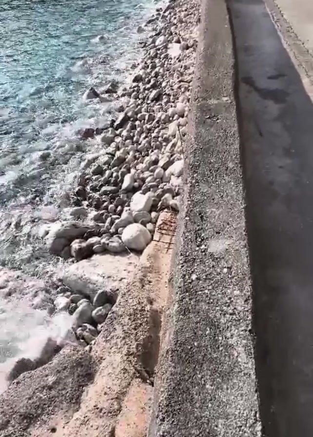 The camera slowly pans along a stone walkway that runs parallel to a rocky shoreline. The sea, clear and turquoise, laps gently against the stones. A large, dark rock formation juts out of the water in the distance, contrasting with the bright sky. The shoreline consists of various sized stones, from pebbles to larger rocks. The walkway is made of concrete and slightly elevated above the beach. The overall scene is calm and peaceful, suggesting a coastal environment on a sunny day.