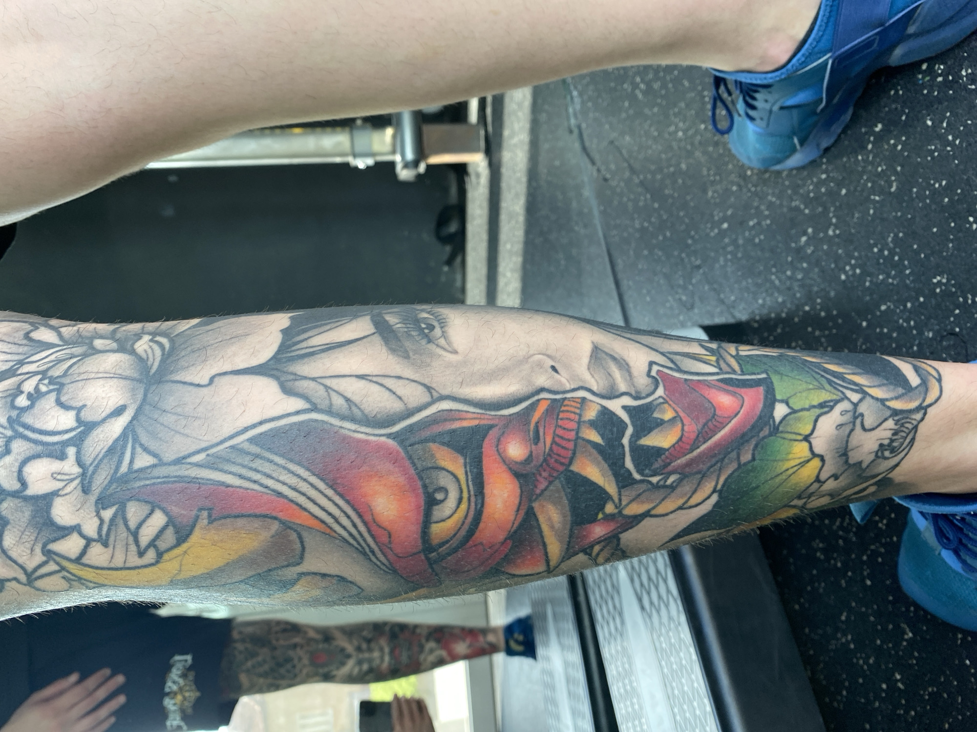 A close-up image shows a lower leg with a tattoo. The tattoo depicts a woman's face, floral patterns, and a colorful fish-like creature. The leg is positioned with the foot pointing towards the upper right corner of the image. The foot is wearing a blue athletic shoe. The leg appears to be resting on or near some type of equipment, possibly at a gym, since the background consists of gym flooring. The reflection of a person wearing blue socks, shorts, and a t-shirt is visible in the bottom of the picture and a tattoo on their leg. The photograph was taken in an indoor environment with natural lighting. There is no indication of Pleven, Bulgaria in the picture.