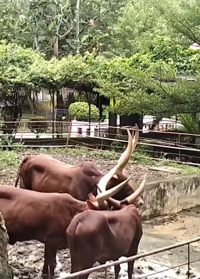 - "three brown cattle, most likely Ankole-Watusi, with large, impressive horns, standing in a concrete enclosure" by FM-sAcf03, licensed under CC BY 4.0
