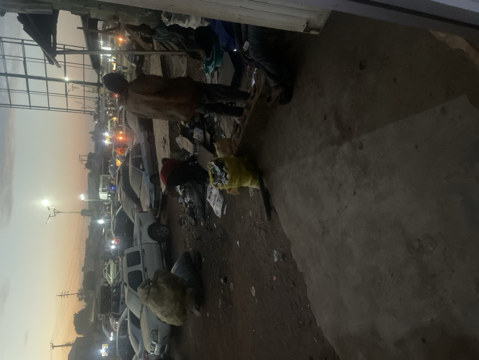 A bustling scene unfolds with numerous parked vehicles illuminated by streetlights against a dusky sky. Litter and debris scatter across the ground, amidst individuals scavenging or sorting through the items. The photo captures an urban area possibly at dawn or dusk, highlighting the stark contrast between basic necessities and the challenges of living in an area marked by apparent poverty. The composition emphasizes a roadside view with the presence of informal commercial activities and visible waste.