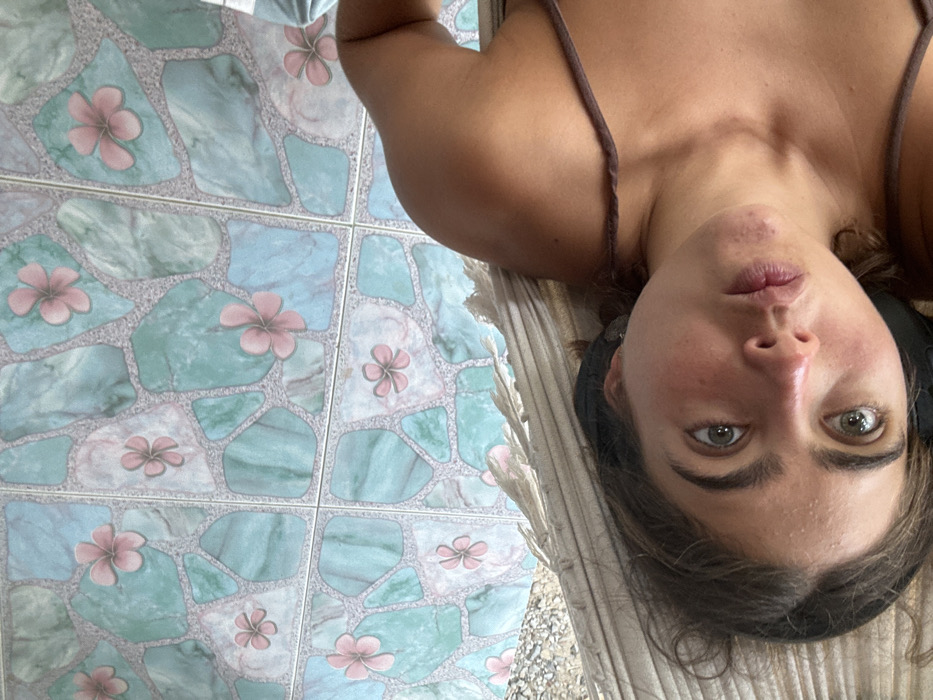 A person with olive skin, brown hair, and green eyes is reclined, possibly in a hammock or on the floor, with their head tilted towards the camera. They are wearing a thin-strapped top and headphones. The background features a patterned tile floor with blue and green geometric shapes interspersed with pink flower designs. The person's face is clear, showing some minor blemishes, and their expression is neutral, almost looking directly at the viewer.