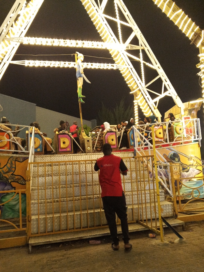 - "An amusement park ride, lit with bright lights, is occupied by riders in seats with D shapes on them" by FM-q4R863, licensed under CC BY 4.0