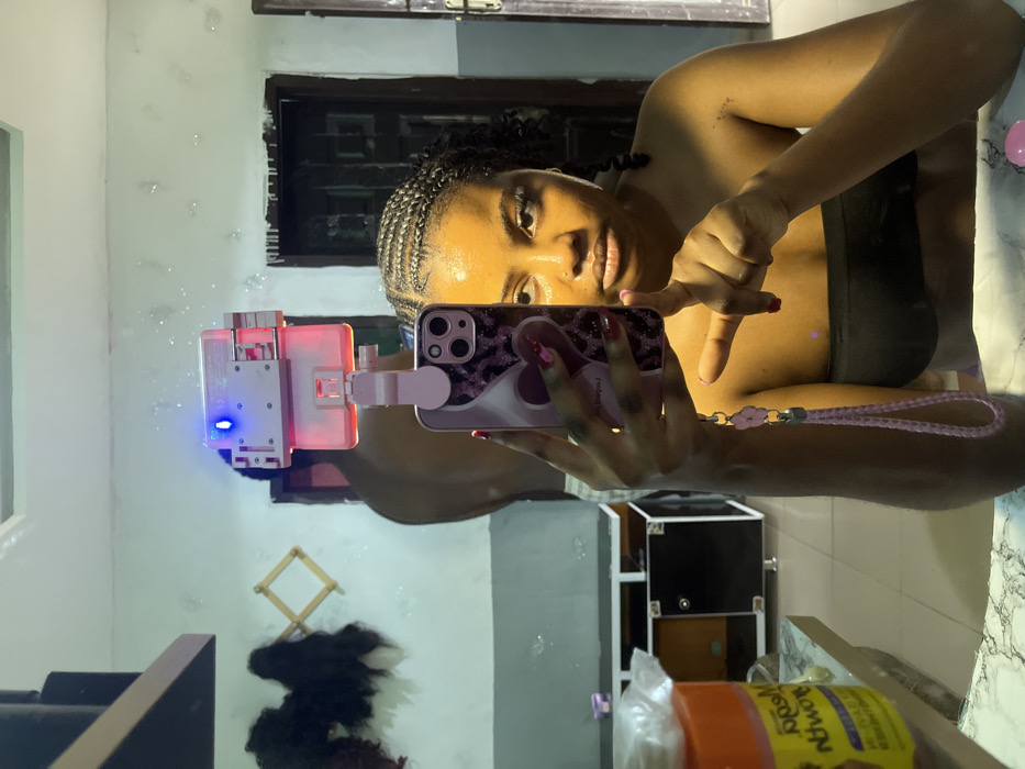 The image depicts a mirror selfie taken in an indoor setting in Gbongan, Nigeria