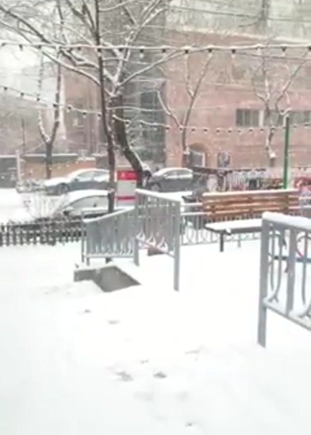 snow-covered playground on a winter day. Snow is falling heavily. The playground has metal railings, benches, swings, and a seesaw, all covered in snow. Trees, bare of leaves, stand around the playground. Buildings are visible in the background. Cars are parked along the street. The atmosphere is cold and quiet due to the heavy snowfall.