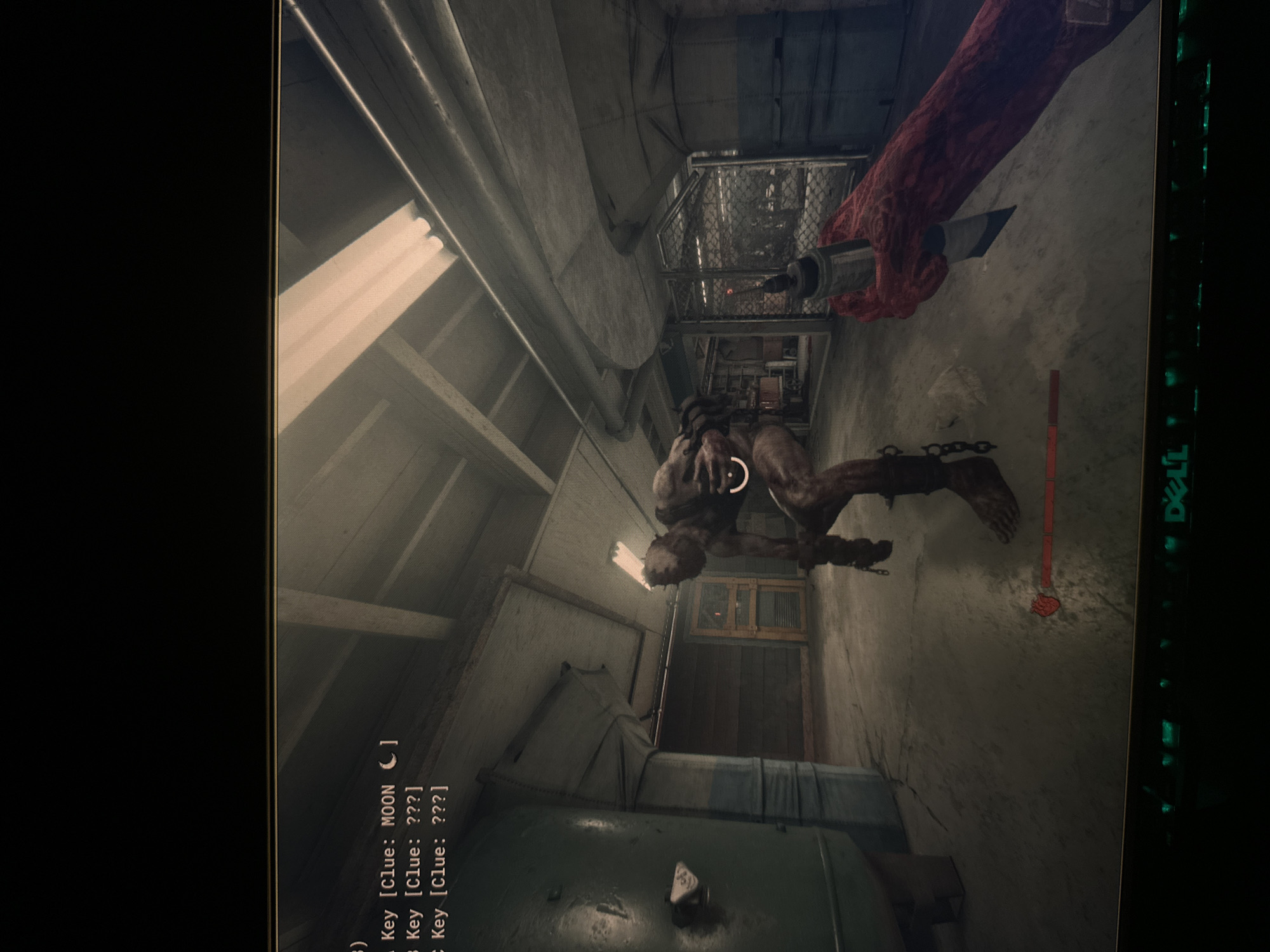 The image displays a first-person perspective scene from a video game, set within an underground or industrial facility in Sofia, Bulgaria. The environment features a concrete floor and ceiling, with exposed pipes and two active fluorescent light fixtures providing illumination overhead. On the left, a large, cylindrical green tank or piece of industrial equipment stands. In the background, a light brown wooden door with a small window is visible, and to the right, a metal grate or fence separates areas of the facility. In the center foreground, an emaciated, bipedal humanoid creature stands, facing generally towards the viewer's left. Its skin appears dark and raw, and its bare feet are connected by chains around its ankles. A white, circular, smiling emoji-like symbol is overlaid on its upper torso, and a red horizontal bar with a heart icon, indicative of a health meter, is positioned on the floor near its feet. From the player's perspective, a hand, appearing reddish and textured, is prominently displayed on the lower right, grasping a metallic object that resembles a large syringe or modified tool with a sharp, reflective blade. Overlaid in the upper left corner of the display are game interface elements, listing objective cues: "A Key [Clue: MOON C]", "B Key [Clue: ???]", and "C Key [Clue: ???]". The lower edge of the image reveals the illuminated keyboard and a partial "DELL" logo from the monitor displaying the game.