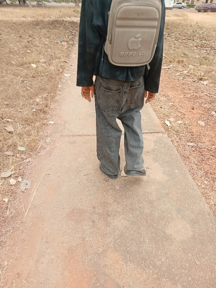 An individual is depicted walking away from the camera on a light brown, coarse-textured paved path in Chekpa, Nigeria. The subject wears a dark blue or grey long-sleeved top, faded dark grey loose-fitting jeans, and dark footwear. A light grey backpack featuring an embossed apple logo and "HPPOLLO" text is worn on the subject's back. The right foot is elevated, indicating forward motion. Flanking the path is reddish-brown soil with sparse, dry vegetation and scattered debris. In the background, beyond more dry ground and vegetation, a road is visible with several vehicles, including a white car and a dark red car. Buildings with light walls and red roofs are present on the far right, and a bicycle is partially visible on the far left.