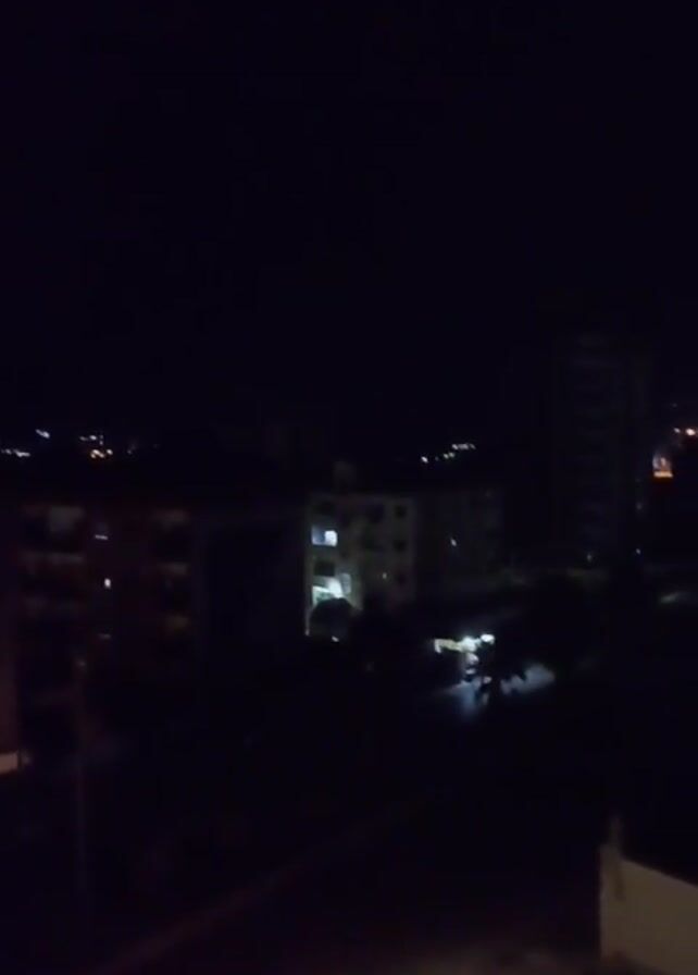 nighttime cityscape, very dark with a few scattered lights from buildings and streets. The foreground is dominated by shadow, obscuring details, but we can make out the shapes of buildings. In the middle distance, there are several multi-story buildings, some with illuminated windows. Further in the background, there are some brighter lights, possibly indicating a more populated area or a distant city. The overall impression is one of urban darkness with limited visibility. The camera seems stationary.