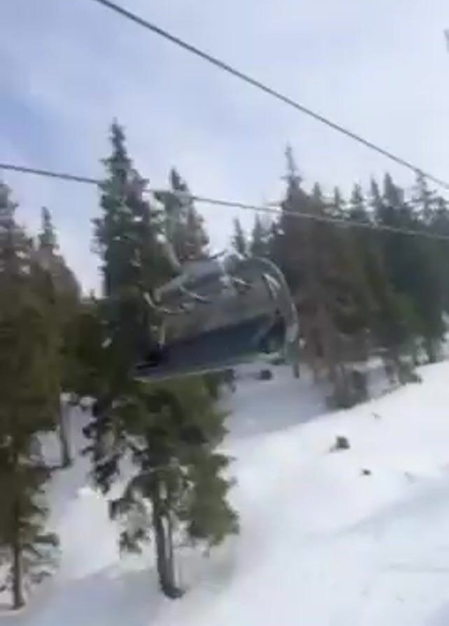 A person wearing a purple ski jacket and a helmet with blue tinted goggles is recording a video from a ski lift. The person is facing the camera. The chairlift is going up a snow covered mountain with trees. The person's skis are visible below.