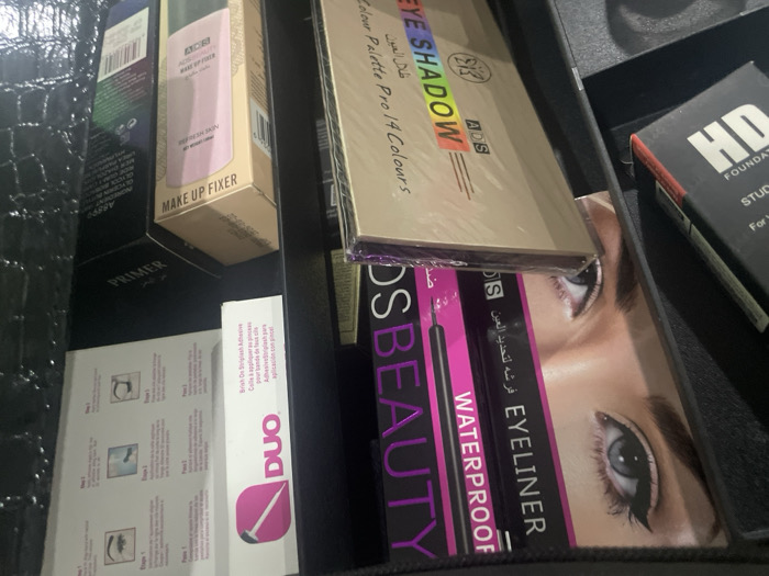 An assortment of makeup products fills a textured, black case. Items include a "Primer" box, "Make Up Fixer" spray, "Duo" eyelash adhesive, "ADS Beauty Waterproof Eyeliner," and an "ADS Eye Shadow Colour Palette Pro 14 Colours." A partially visible "HD Foundation Studio" is also present. The packaging includes details like usage instructions and descriptions in both English and Arabic.