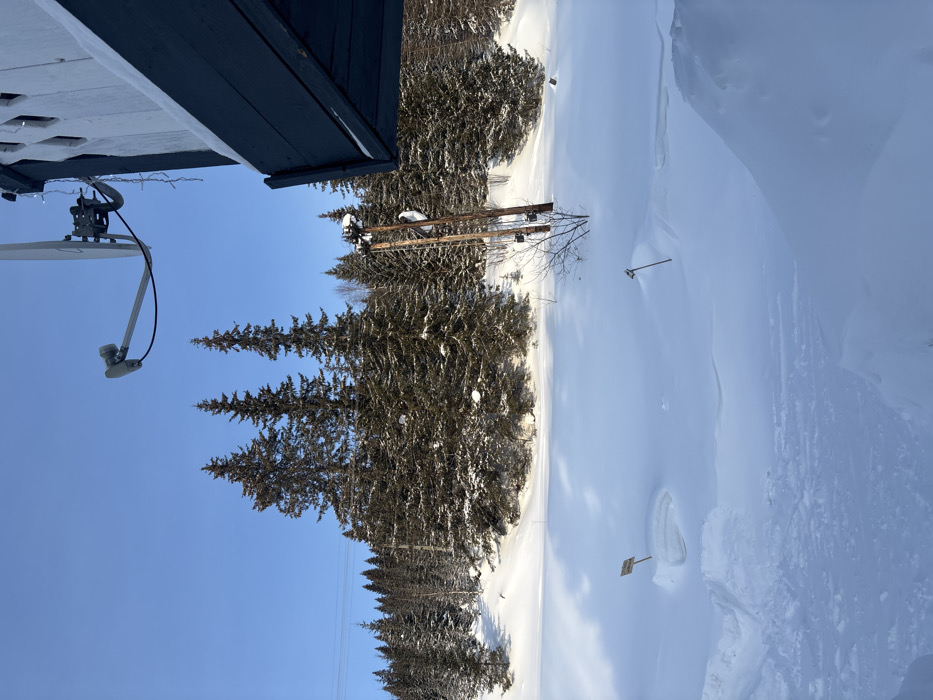 A wide-angle exterior view depicts a snow-covered winter landscape in Усьва, Russia, under a clear blue sky. The scene is dominated by deep, undisturbed snow covering the ground, extending to a dense coniferous forest in the background. In the upper right foreground, a dark blue wooden building structure, possibly a roof overhang or balcony, is visible, adorned with white decorative elements and faint string lights. A white satellite dish with a black cable is mounted high on this structure. The immediate foreground features a cleared snow path or track leading towards the center. In the midground, a small, light-colored wooden sign partially emerges from the snow on the left, and a dark, slender pole-like object protrudes from the snow on the right. Two wooden utility poles, partially covered in snow, with insulators and cross-arms, stand further back in the midground. A small, bare deciduous sapling is also visible, mostly buried in snow, near the utility poles. The background consists of a thick, snow-dusted forest of tall, dark green evergreen trees, situated on an elevated terrain. The sunlight is bright, casting distinct shadows on the snow. No individuals are visible.