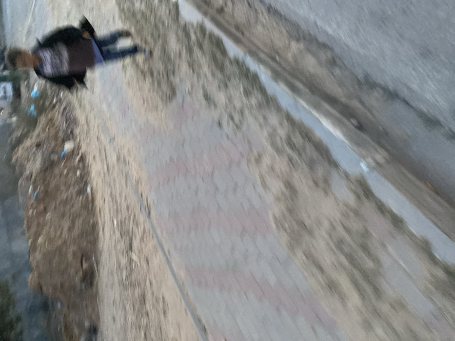 A person in dark clothing and jeans walks on a sidewalk composed of light and dark paving stones. The sidewalk is bordered by a rough, uneven verge and a concrete curb. The perspective is angled, suggesting the photograph was taken from an elevated position. There's a sense of motion blur. Debris litters the verge.