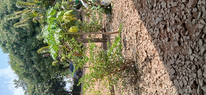 The scene depicts an outdoor, sunny environment in Shaba, Nigeria. The foreground consists of light brown to grey gravel and small rocks covering the ground, with a distinct shadow diagonally bisecting the lower half of the frame. In the mid-ground, a dense green bush stands to the left, and a slender, tall tree trunk with sparse foliage at its top is positioned to the right. Various other smaller plants and trees are scattered throughout the mid-ground and background. A large, mature tree with a full green canopy occupies the upper center and left, extending towards the top of the frame. In the background, behind the mid-ground vegetation and to the left, a silver or light grey sedan vehicle is partially visible, parked on what appears to be a slightly elevated or distant surface; its rear wheel and bumper are discernible. To the far right in the background, a white plastic container is partially obscured by foliage. The sky above is partly cloudy and bright. No individuals or animals are present.