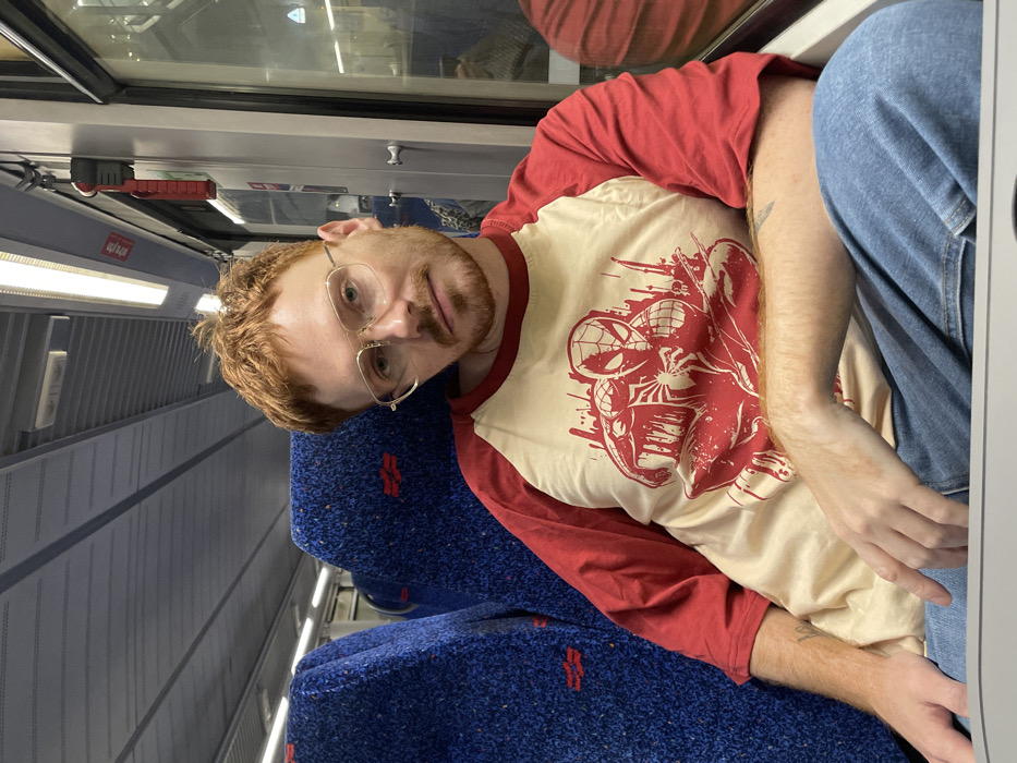A male individual is depicted in a medium close-up, seated inside an Israel Railways passenger train carriage. The subject, appearing to be in his late 20s or early 30s, has reddish-brown, slightly disheveled hair, a reddish-brown beard, and wears thin gold-framed square eyeglasses. He is looking directly at the camera. He is dressed in a cream-colored raglan t-shirt with red sleeves, featuring a prominent red graphic of Spider-Man in an action pose on the chest, and blue denim jeans. A subtle tattoo is visible on his left forearm. The interior of the train carriage is visible, featuring blue, textured fabric seats with a red Israel Railways logo discernable on the seatback behind the subject. Overhead, grey, ribbed luggage racks extend along the ceiling, illuminated by fluorescent strip lighting. A train window to the subject's right displays a blurred reflection of the carriage interior and an indistinct exterior environment. A red emergency pull handle or device is mounted on the wall adjacent to the window. The train is identified as part of the Israel Railways network, consistent with operations in or around the city of Holon, Israel.