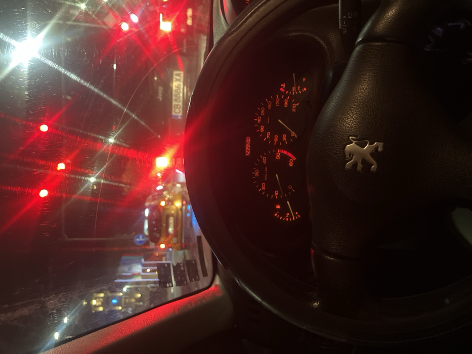 - "The image depicts a nighttime scene from the interior of a vehicle, specifically a Peugeot, looking out through a wet or dirty windshield, which causes light sources to appear as starbursts and streaks" by FM-4oKLL2, licensed under CC BY 4.0