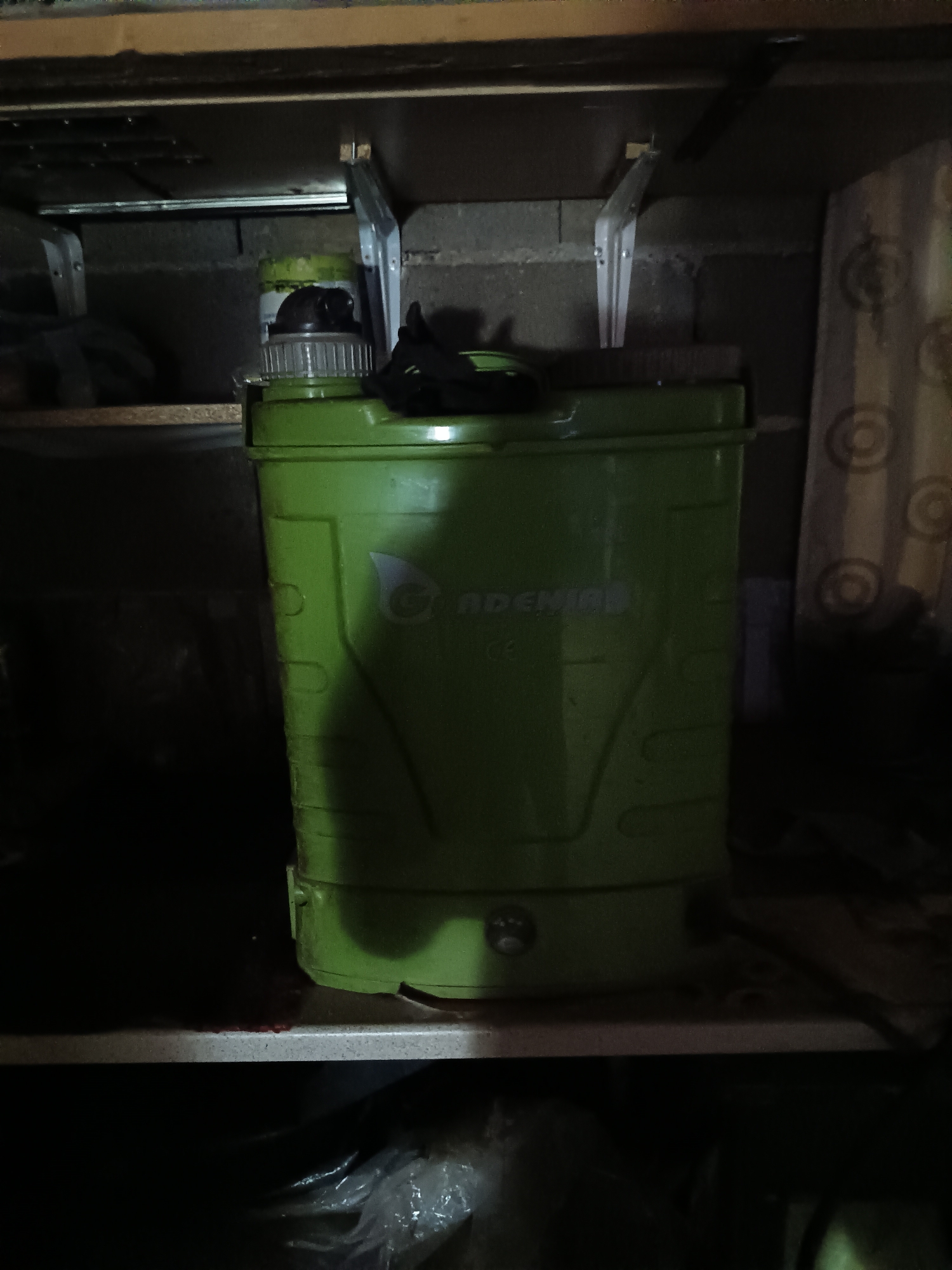 green, cylindrical sprayer can with the word "ADENAL" on it. It is sitting on a shelf in a cluttered, dimly lit space. Above the sprayer can, there are shelves supported by metal brackets attached to a brick wall. Other objects are partially visible on the shelf next to the sprayer can, and a plastic bag is on the shelf below. The location is unknown.