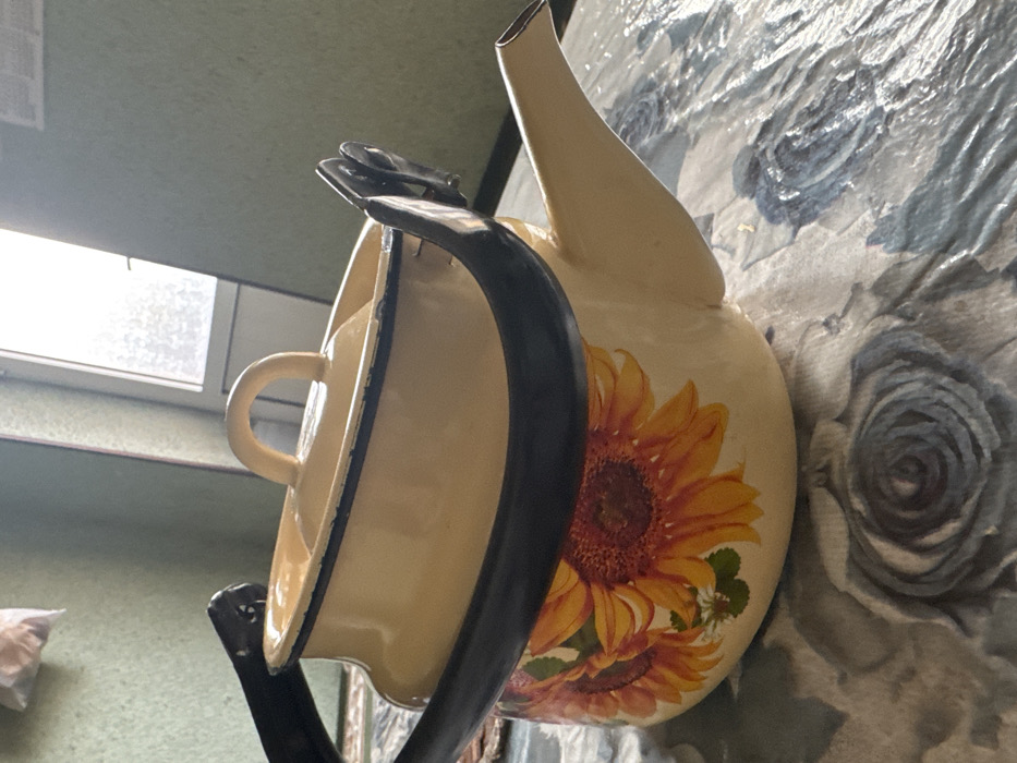 An enameled teapot and a smaller enameled pot are depicted in an indoor setting in Rishtan, Uzbekistan. The larger, primary object is a light yellow teapot with a prominent black metal handle arcing over its top. The teapot's body is decorated with multiple large, vibrant orange and yellow sunflower images. A tapered spout extends from its right side. Resting inside the teapot's opening is a smaller, matching light yellow enameled pot or lid, featuring a small loop handle on its top and a dark-colored rim exhibiting wear. Both enamelware items display signs of use, with chipped or faded dark trim along their edges. They are situated on a surface covered by a patterned tablecloth featuring muted blue or gray floral designs, resembling roses. The background consists of a light green wall. A bright, vertically oriented window or glass door, with a light-colored frame, is visible in the upper right section of the background, admitting diffused natural light. In the upper left background, a light brown bag containing indeterminate contents hangs against the green wall. No people are visible.