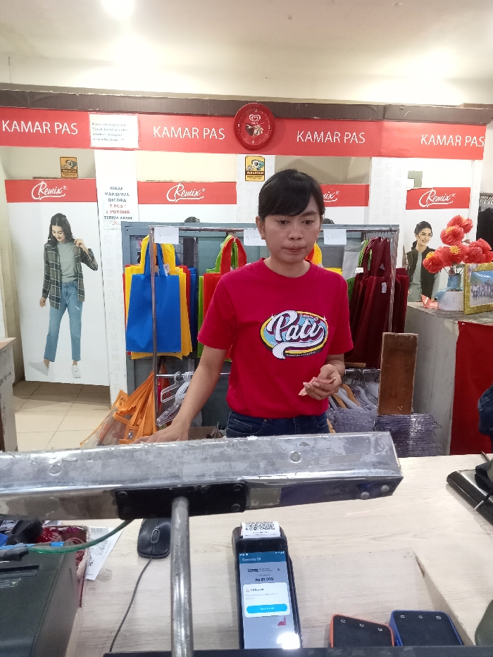 The image displays the interior of a retail establishment, identified as a clothing store, located in Kecamatan Pati, Indonesia