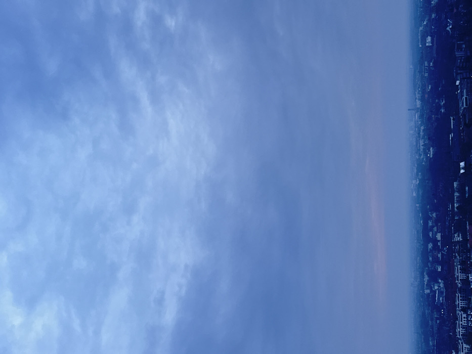 A high-angle, wide-view photograph captures a sprawling urban landscape in Hamburg, Germany, under a heavily overcast sky. The image is dominated by a cool blue and grey color spectrum, consistent with twilight or a densely clouded day. The upper 70% of the frame consists of layered, textured cloud cover, ranging from lighter blue-grey at the top to darker tones mid-frame. The lower 30% presents a vast cityscape, extending to the distant horizon. Foreground elements show clusters of low-rise buildings, some with visible white facades, intermingled with dark green tree canopy. Moving towards the background, urban structures become progressively obscured by atmospheric haze, appearing as indistinct dark blue-grey silhouettes against a subtly pinkish-purple hue at the furthest horizon line. No people, vehicles, or dynamic actions are visible.