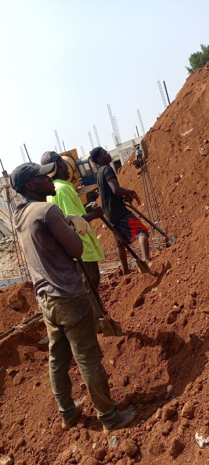 Three adult males are observed at a construction site in Abuja, Nigeria, under a clear, bright sky