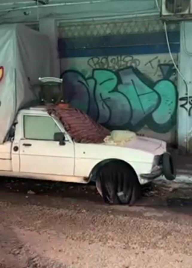 white pickup truck parked on a street with graffiti on a nearby wall. The truck appears to be in disrepair, with objects covering parts of it. Another vehicle passes by quickly in the foreground of the frame. The setting is an urban street environment with overhead lighting.