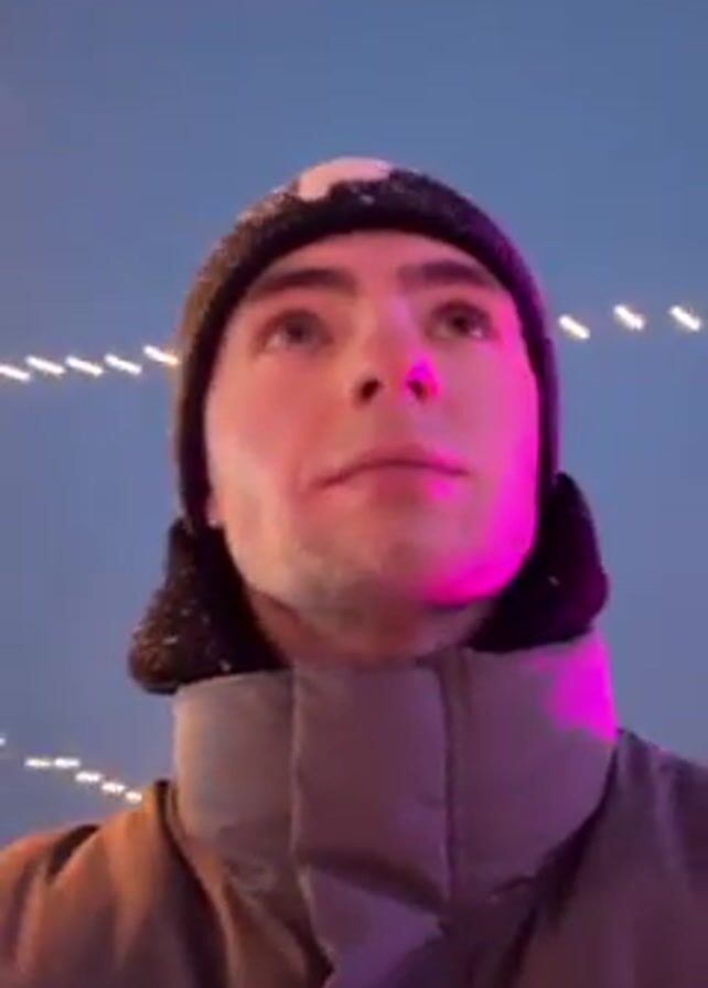 A young man is recording a selfie video. He is wearing a black beanie and a gray puffer jacket. The background is a snowy night scene illuminated by strings of lights and a color-changing display. It appears to be snowing lightly. The man is looking directly at the camera.
