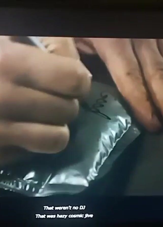 man in a black shirt writing "Goodbye Mars" on a silver pouch