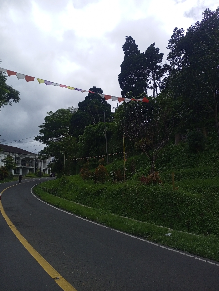 A curving asphalt road with a yellow line on the left side cuts through a lush green landscape under an overcast sky. Vibrant prayer flags are strung across the scene, from left to right. A building with prominent balconies is visible in the background on the left. Dense vegetation covers a hillside to the right. A motorcycle is also seen on the road ahead.