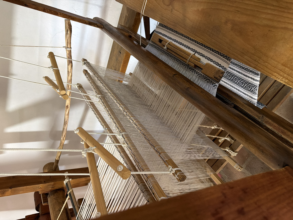 A low-angle shot depicts a wooden loom with numerous white threads stretched tautly