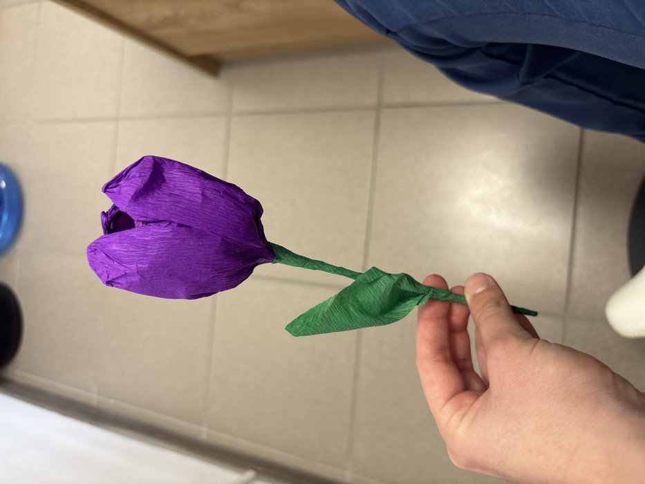 An indoor scene in Plovdiv, Bulgaria, captures a right human hand holding a single purple and green craft flower. The flower's bloom is formed from deep purple, crinkled crepe paper, shaped like a tulip, with visible folds and texture. The stem and a single pointed leaf are crafted from green crepe paper. The hand, displaying visible knuckles and fingernails, grips the lower section of the green stem. The immediate background features a light-colored, square-tiled floor with discernible grout lines. To the right of the hand, a portion of a person's leg, clad in dark blue fabric, is visible. In the blurred background, partial views of a white vertical surface, a dark rounded object, a blue rounded object on the floor, and a light-brown wooden furniture piece are present.