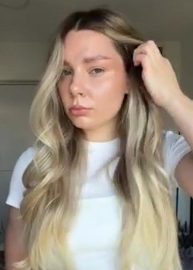 A person with long, wavy blonde hair, wearing a white t-shirt, stands indoors. The person touches their hair, parting it to the side, and looks directly at the camera with a serious expression. Background objects include a door, a vent, and a mirror. The room appears to be lit by natural light.
