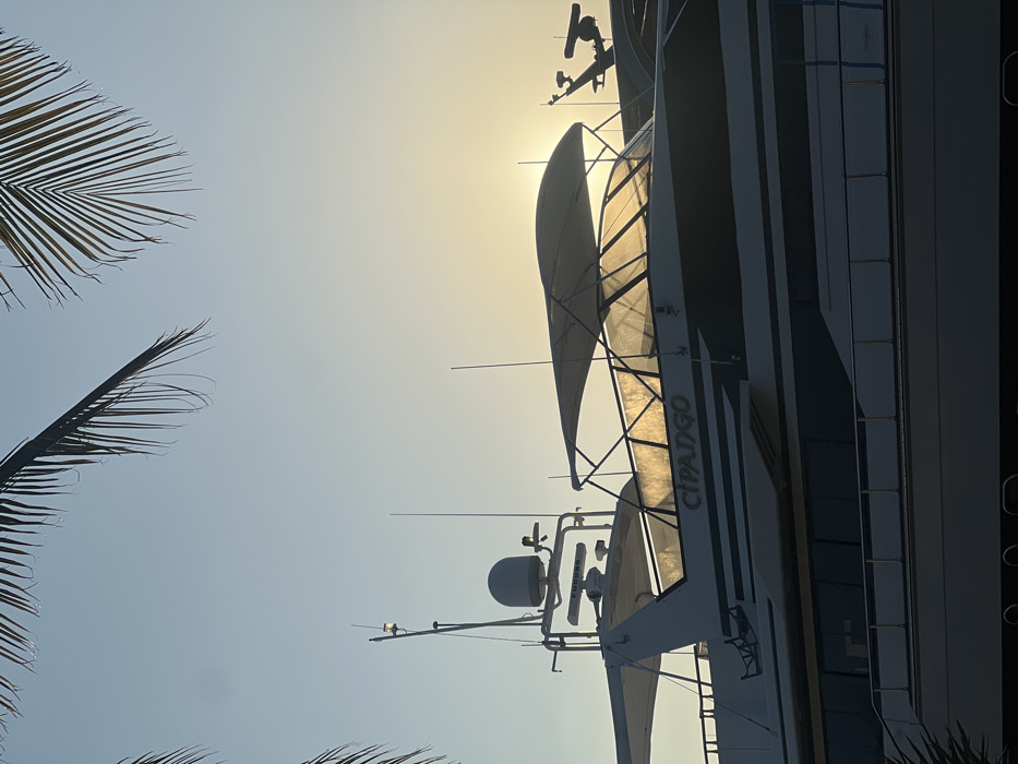 A luxury yacht is seen against a bright, hazy sky at sunset or sunrise. Palm fronds frame the left side of the image. The yacht's name, "CIPANGO," is visible on the side. The masts, satellite dishes, and awnings of the yacht create a complex silhouette against the light. The light seems to be obscuring the details of the yacht.