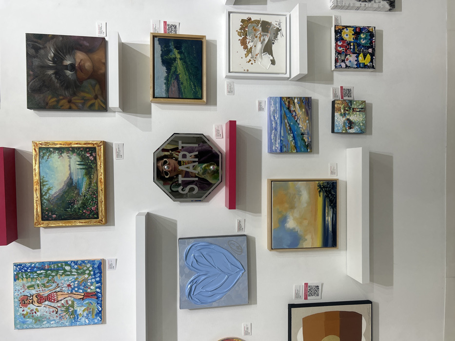 A collection of diverse artworks adorns a white wall. Subjects range from a portrait of a dog to landscapes and abstract pieces. Frames vary in style, from ornate gold to minimalist white. One unique piece is an octagonal mirror reflecting a person wearing sunglasses. Tags are affixed beneath each artwork. The arrangement creates a visually engaging and eclectic gallery display.