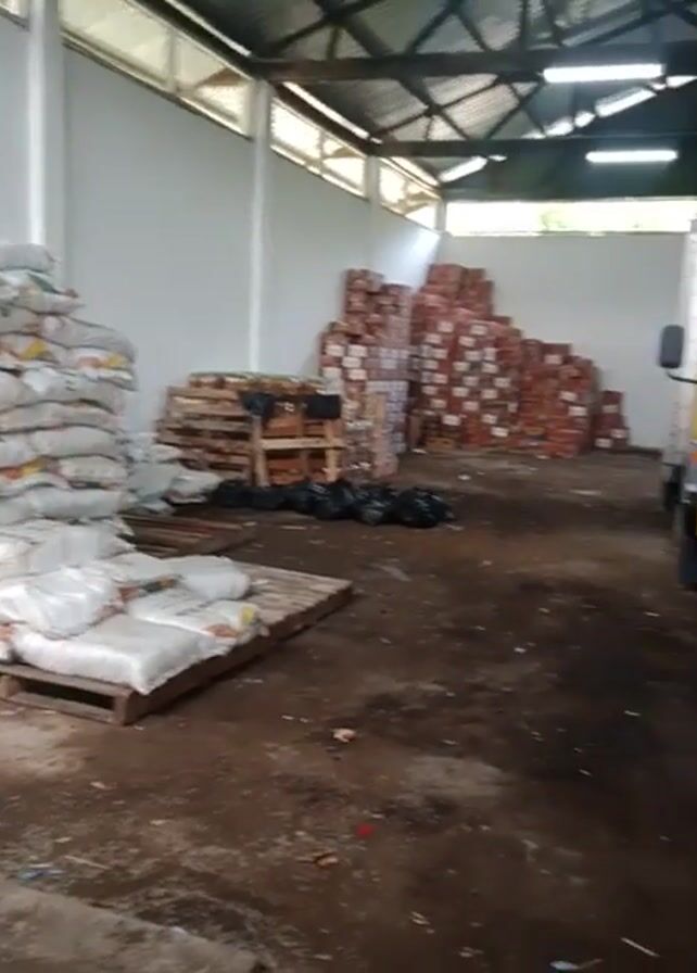 interior of a warehouse. Stacks of boxes and pallets laden with sacks are stored inside. Several individuals are gathered around a small truck. They are holding a banner, although the banner is blurry and not completely legible. The floor appears to be dirty. The light appears to come from an opening in the roof.